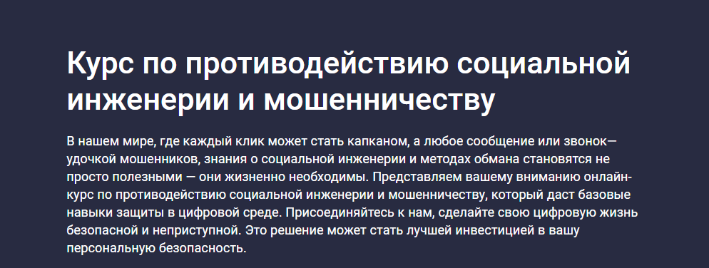 Представляем вашему вниманию онлайн-курс по противодействию социальной инженерии и мошенничеству, который даст базовые навыки защиты в цифровой эпохе. Присоединяйтесь к нам, сделайте свою цифровую жизнь безопасной и неприступной. Это решение может стать лучшей инвестицией в вашу персональную безопасность.