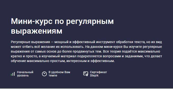 Регулярные выражения — мощный и эффективный инструмент обработки текста, но их вид может отбить всё желание их использовать. На данном мини-курсе Вы изучите регулярные выражения от самых основ до более продвинутых тем. Вся теория подаётся максимально кратко и просто, а изучаемый материал подкрепляется вопросами и заданиями, что делает обучение максимально простым, интересным и эффективным.