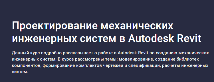 Данный курс подробно рассказывает о работе в Autodesk Revit по созданию механических инженерных систем. В курсе рассмотрены темы: моделирование, создание библиотек компонентов, формирование комплектов чертежей и спецификаций, расчёты инженерных систем.