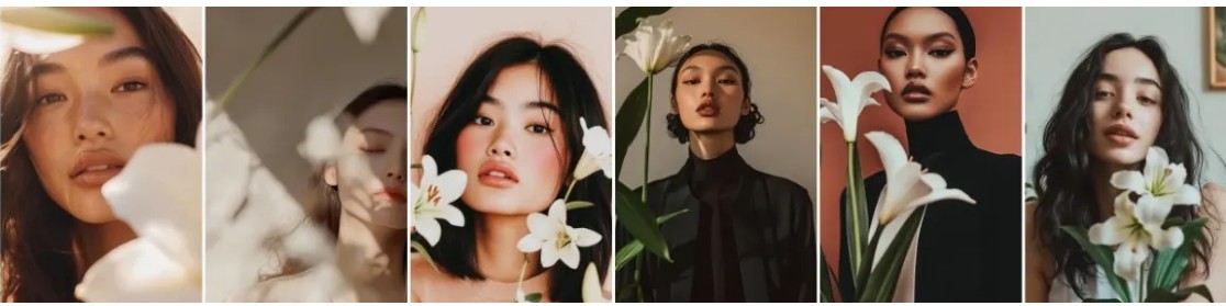 A poetic portrait of an Asian woman partially obscured by delicate white lilies, the petals and green stems crisscrossing her serene face.