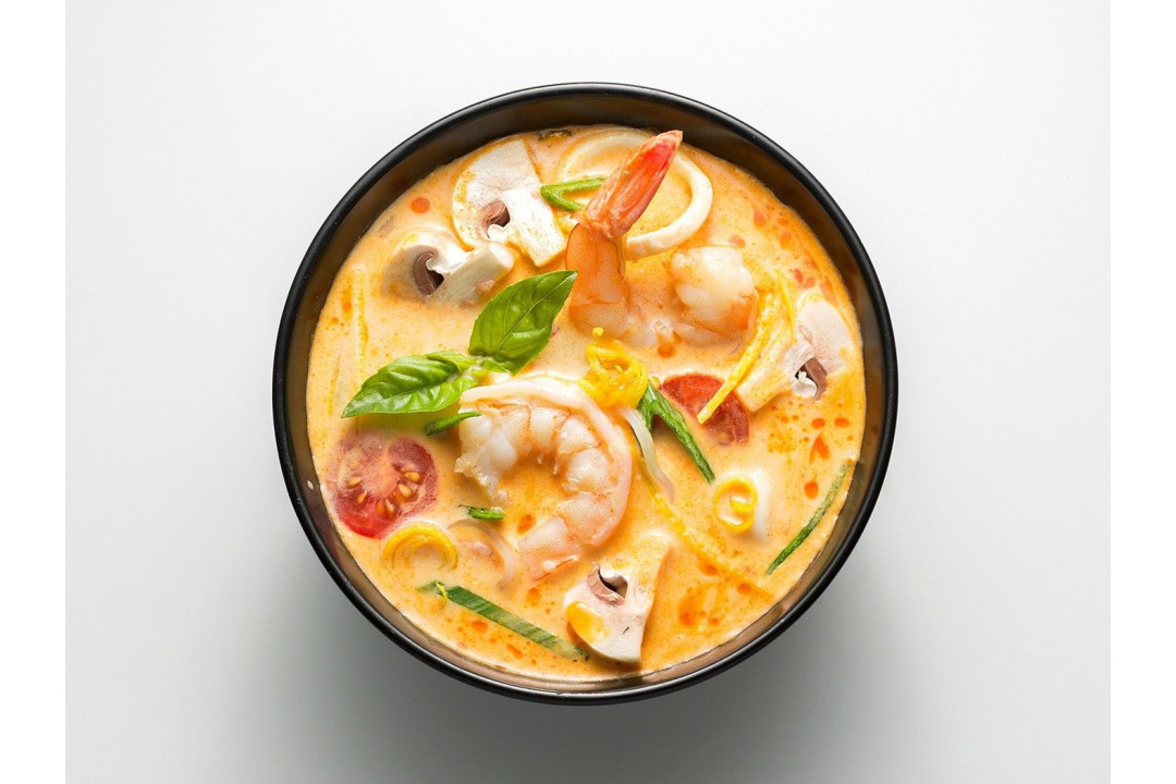 Суп «Том ям» — это как погружение в шумный азиатский рынок, только в тарелке. Никаких компромиссов: бульон варится с галангалом, лемонграссом и листьями каффира, чтобы придать основе тот самый узнаваемый цитрусовый шлейф.
