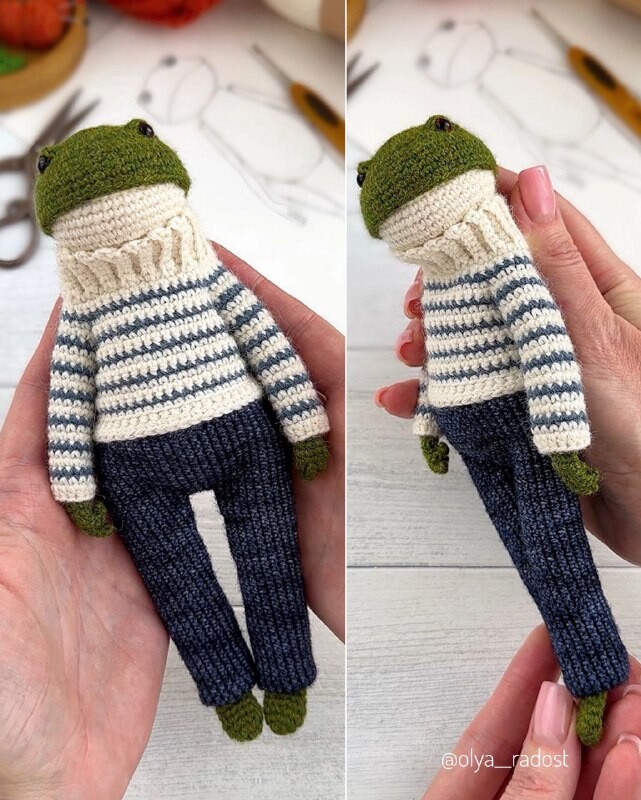 Предлагаю Вашему вниманию подробный мастер-класс по вязанию (крючком) свитера и штанов для игрушки ростом 20 см. Этот комплект одежды разработан для моей лягушки. Также свитер на определённом этапе вязания легко трансформировать в жилет или футболку. МК рассчитан на тех, кто уже умеет вязать крючком. МК очень подробный с поясняющими фотографиями.