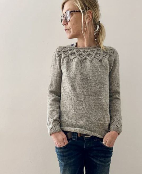 Джемпер вяжется сверху вниз с красивым кружевным узором в верхней части кокетки. Сначала провязывается несколько коротких рядов взад и вперед, чтобы сделать горловину более высокой, а затем кокетка вяжется круговыми рядами сверху вниз до разделения на рукава. Провязывается несколько последних коротких рядов, чтобы завершить формирование кокетки, непосредственно перед тем, как отложить петли для рукавов. Затем вяжется основная часть до подола. Отложенные петли возвращаются на спицы, чтобы провязать рукава сверху вниз до кружевного узора на манжетах. Никакой дополнительной отделки не требуется.