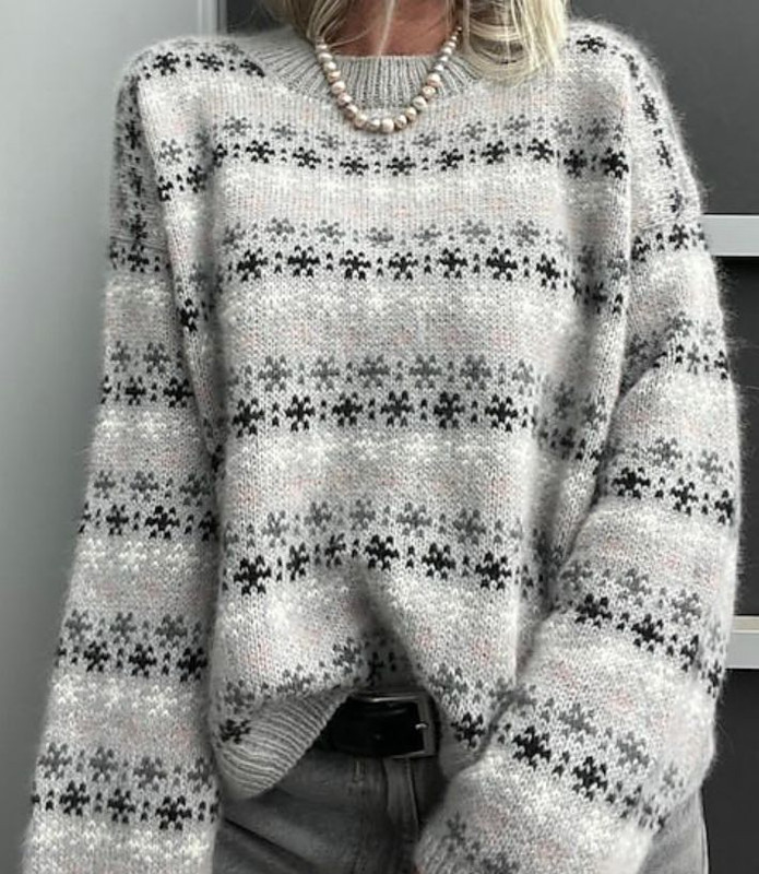 Узор: жаккардовый, с повторяющимися мотивами, напоминающими снежинки или геометрические фигуры. Узор расположен горизонтальными полосами по всей поверхности свитера — на корпусе, рукавах и плечах.
