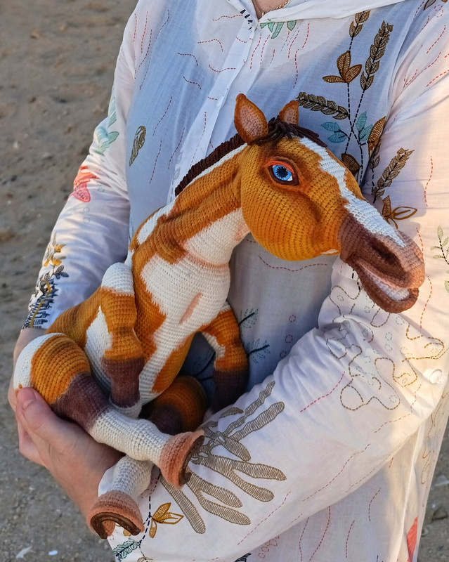 МК в формате PDF подробная схема с множеством фотографий, плюс видео уроки сложных моментов. Высота лошади около 35 см из указанных ниток, можно вязать из любых. Но для тонировки рекомендую хлопок и полухлопок по составу. Мои работы можно вязать из ниток любой толщины. Единственное, из плюша будет трудно работать со сменой цвета и тонируется он трудно. Связана лошадка из ниток Alize Cotton Gold. Пять цветов, можно сократить до трёх: ◦Бежевый телесный номер 161, меньше 50 гр, для передней части головы и копыт. ◦Шафрановый номер 02 основной для всех частей тела 100 гр. ◦Белый основной для всех частей тела 100 гр. ◦Светло-бежевый 67 для нижних частей ног меньше 50 гр, можно использовать основной белый. ◦Светло-розовый 382 небольшое количество для языка, можно окрасить белый. ВАЖНО, то что связано в два цвета, нужно вязать в два цвета. Если у вас достаточно опыта, то вы можете изменить рисунок пятен на свой вкус и или вообще уйти от них, сделав, например, живот и спину однотонными. Также рекомендую не усложнять и не вязать тремя цветами одновременно, если вы ещё не знакомы с моими техниками вязания, будет тяжело. Для гривы использованы нитки хлопок в два раза тоньше основной, типа Ириса, у меня Alpina Lena, тёмно-коричневые. Лошадка сидячая в стиле Тедди, но без шплинтов и каркаса, ноги ввязаны. По желанию можете сделать шплинты, для более плотного прилегания конечностей. ПРИШИВНЫХ ДЕТАЛЕЙ НЕТ. Есть утяжеление в попе, чтобы она могла сидеть, и красивая большая голова не перевесила. Необходимы первоначальные уверенные навыки вязания амигуруми и большое желание трудиться! Тонировка также входит в мастер-класс. Процесс не трудный и доступный любому. Использована сухая пастель в авторской технике. По желанию вы можете самостоятельно заменить пастель на другие более знакомые и проверенные материалы. Глаза с ресницами ручной работы. Представленная модель включена в МК. Вам понадобятся стеклянные кабошоны, размер 15 или 16 мм, акриловые краски для росписи или готовые стеклянные глазки. Для оформления век использован эпоксидной пластилин, по желанию можете заменить на полимерную глину или любую другую качественную пластичную массу. Крепление на клей Момент Кристалл. Для ресниц использованы нитки мулине и клей ПВА для укладки. Вы можете оформить глаза любым другим удобным Вам способом.
