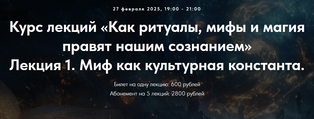 Почему миф и ритуал – не пережитки далекой древности, а самая актуальная современность? Как они представлены в современной культуре и в жизни каждого из нас? Об этом поговорим в рамках курса «Как ритуалы, мифы и магия правят нашим сознанием».