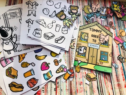 — доп.материалы:»игрушка» Томми, фигурки его друзей, предметы еды для столовой и школьные предметы, костюмчики и туфли. В цветном варианте и раскраской.
