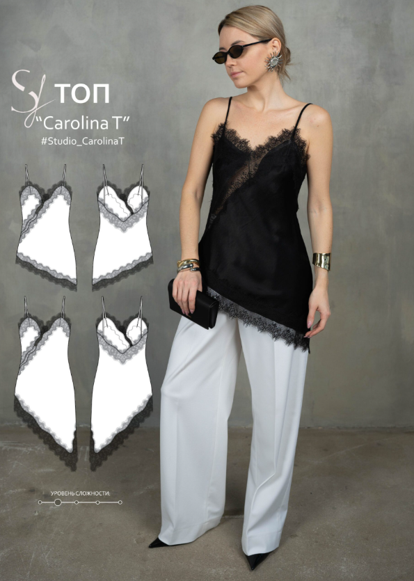 Выкройка топа в косом крое, малого объёма, с асимметрией по низу, с декоративными кружевными вставками. Горловина V-образной формы. Модель на бретельках. Спинка и полочка по низу, а также по рельефным срезам декорированы кружевом. Длина изделия в двух вариантах.