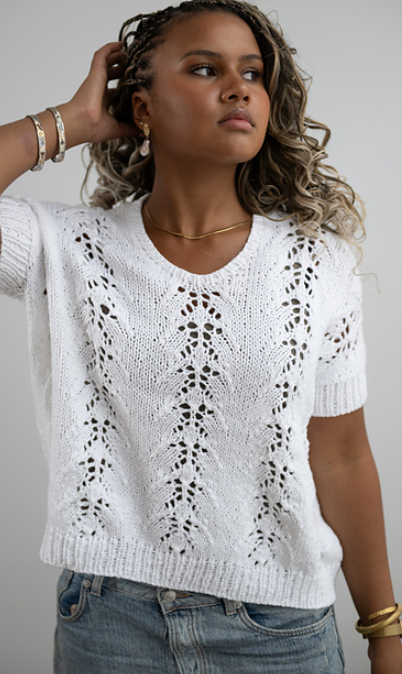 Snorlige V — летняя версия Snorlige. Женственный свитер оверсайз с круглым или округлым V-образным вырезом, спущенными плечами и полосами ажура и лицевой глади. Свитер вяжется сверху вниз. См. примечания к описанию на стр. 5. Размеры 1 (2, 3, 4, 5) Соответствуют размерам XS/S (M/L, L/XL, 2XL, 3XL) и обеспечивает свободу движений. Обязательно выберите размер, который позволяет плечам и верхней части тела лежать свободно. Если вы обнаружите, что нижняя часть тела становится слишком широкой, то уменьшите ширину.