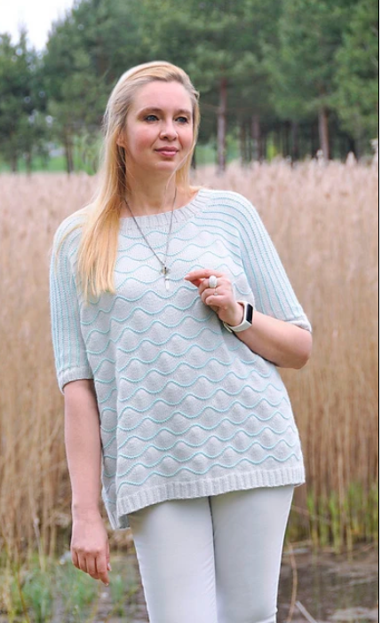 Если звук мы можем представить как волны механических колебаний в любой среде, тогда тишину можно отобразить прямыми параллельными линиями. Любое, хоть малейшее дви жение ветра затрагивает вытянутые струны тишины, и заволновавшийся шелест листьев заставляет нас оглянуться. Ton Sound может быть громким и тихим, все зависит от ва шего выбора цветовых сочетаний. Анатомическую конструкцию здесь, можно сказать, созда ют не вязальные технологии, а волны звука, затихающие в определенной точке времени. Размер: XS-S (SM-ML, L-XL, XXL-XXXL) Обхват груди: 80-90 (92-102, 104-114, 116-126) см Обхват бедер: 86-96 (98-108, 110-120, 122-132) см Окончательный размер изделия на уровне груди: 105 (120, 135, 1500 см Длина спинки (от высшей точки плеча до низа): 69 см Размер чашки: B-D Рост: 165-175 см Предлагаемый припуск на свободу облегания на уровне груди: в среднем 20-30 см. Образец на модели связан по описанию размера L-XL со свободой облегания 30 см. Плотность вязания: спицы 3,25 мм: 21 п. и 34 р. полосатым узором 10х10 см; 2 раппорта узора Sound в высоту 12,5 см, 2 раппорта узора Sound вширину 15 см. Если ваша плотность вязания отличается от той, что указана, измерения деталей и готового изделия будут отличаться от тех, что должны быть в вашем размере. Если описан