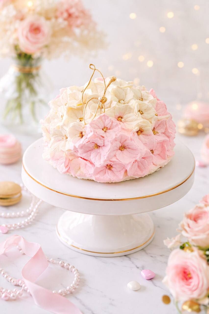 Муссовый бенто-торт в виде гортензии. Вкус апельсиновой начинки с клубнично-сливочным муссом — это сочетание цитрусовой свежести и ягодной сладости.