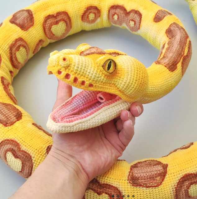Представляю Вашему вниманию мастер-класс по вязанию крючком Королевский Питон Лимон. Длина Питона 1 метр 60 сантиметров, длина головы 12 см. Использованы нитки полухлопок Alize Gold Cotton 187 — светло-жёлтый основной цвет для спинки, 200 грамм 01 – молочный цвет для живота 100 грамм 446 — тёмная пудра, бежевый с розоватым оттенком для пятен 100 грамм. 382 – пудра для внутренней части пасти небольшое количество ниток. Можно заменить на другие нитки со сходным метражом рекомендую 100% хлопок и полухлопок (близкие аналоги Madame Cotton аналог, Yarnart Jeans). Если метраж пряжи или ниток будет другой, то изменится размер готовой работы. Обязательно вязание в два цвета в моей технике, иначе можно сильно нарушить форму. Этому не сложно научиться, я подробно объясняю как это сделать. Возможно вязание без пятен только в два цвета спинки и живота, или Вы можете заменить мои пятна на свой рисунок. Мастер-класс в формате pdf максимально подробный, содержит подробное описание с множеством фото примеров. Все формы головы вывязаны, утяжек нет. Пришивные детали — это ноздри и частично веки. Есть видео-уроки по сложным моментам. Внутри жёсткий проволочный каркас, он обязателен. Инструкция включена в МК. Инструкции по изготовлению глаз включены в МК. Вы можете сделать другое оформление на Ваш вкус. Тонировка выполнена в авторской технике, также включена в мастер-класс и это тоже очень просто. У змея весь рисунок — это подчёркивание уже готовых вывязаных элементов. Прилагается файл для экономичной печати без фотографий.