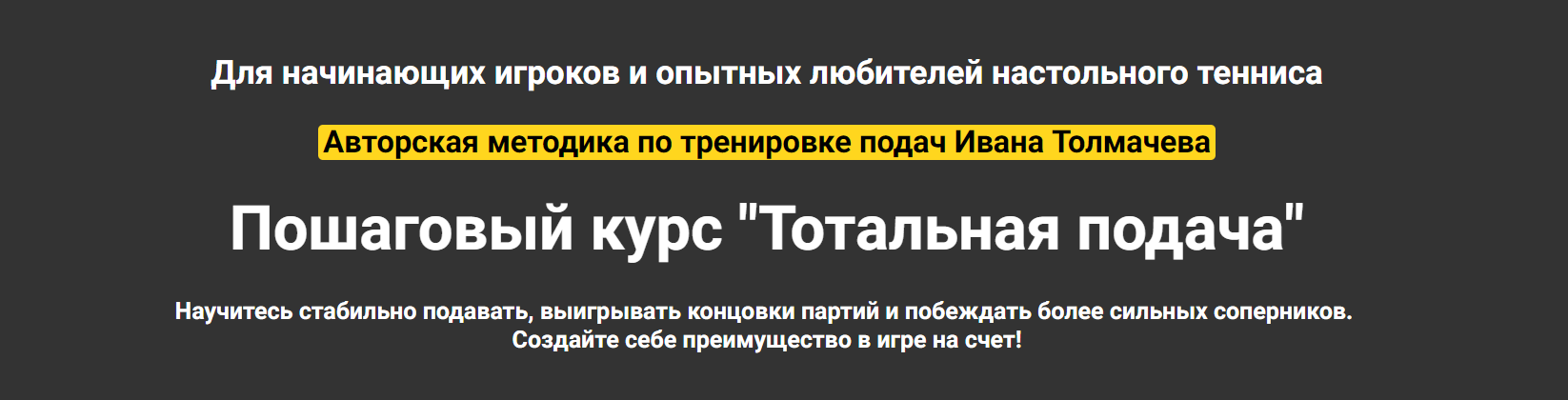 подробно технику каждой подачи и разберёмся, как с помощью простых упражнений ей обучиться. После этого вы значительно расширите свой арсенал, ведь в курсе собраны 18 вариаций подач — от начальных, для тех, кто только начинает свой путь, до профессиональных, которые используются опытными игроками.