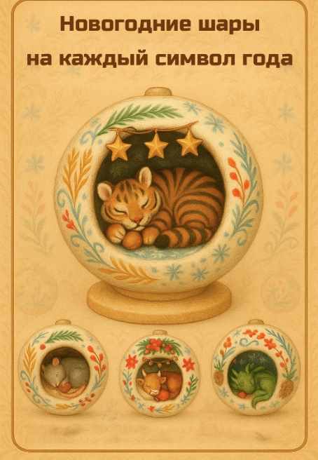 Особенности: — Шары с символами каждого года: от милых зверят до изящных стилизаций — Идеи для создания ватных и текстильных игрушек — Атмосфера зимнего чуда и вдохновения для новогоднего творчества