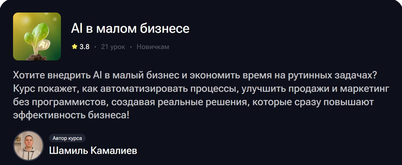 Курс «AI в малом бизнесе» с Шамилём Камалиевым — это 21 занятие о том, как внедрить искусственный интеллект в реальную работу без программистов, консультантов за миллион и долгих мучительных внедрений, после которых хочется всё вернуть как было.