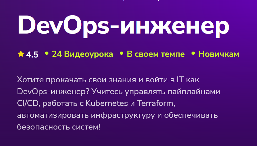 Хотите прокачать свои знания и войти в IT как DevOps-инженер? Учитесь управлять пайплайнами CI/CD, работать с Kubernetes и Terraform, автоматизировать инфраструктуру и обеспечивать безопасность систем!