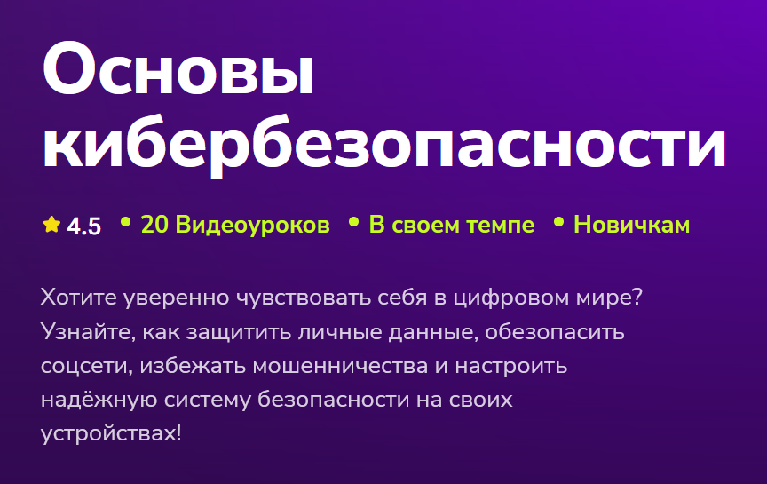 Курс идеально подходит тем, кто хочет уверенно пользоваться интернетом, опасается цифровых угроз и стремится настроить свой компьютер, смартфон и домашнюю сеть на максимальный уровень безопасности.