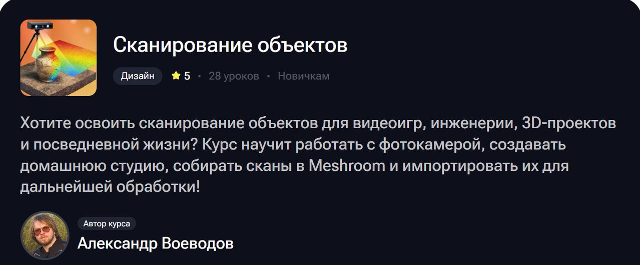 Курс «Сканирование объектов» Александра Воеводова — это 28 структурированных занятий с фокусом на практику: от первого кадра до готовой модели в твоём любимом 3D-пакете. Без воды, без общих слов, без «а теперь попробуйте сами разобраться».