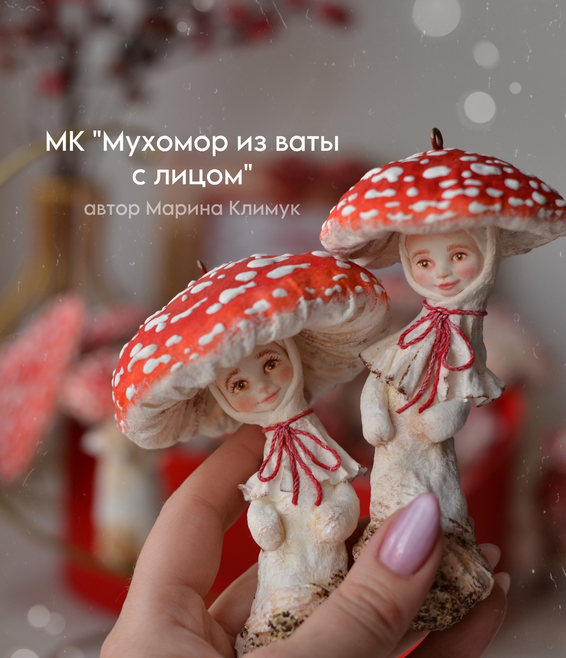 мк «Мухомор из ваты с лицом». Игрушка елочная 13 см, лицо на основе молда и глины самозатвердевающей.
