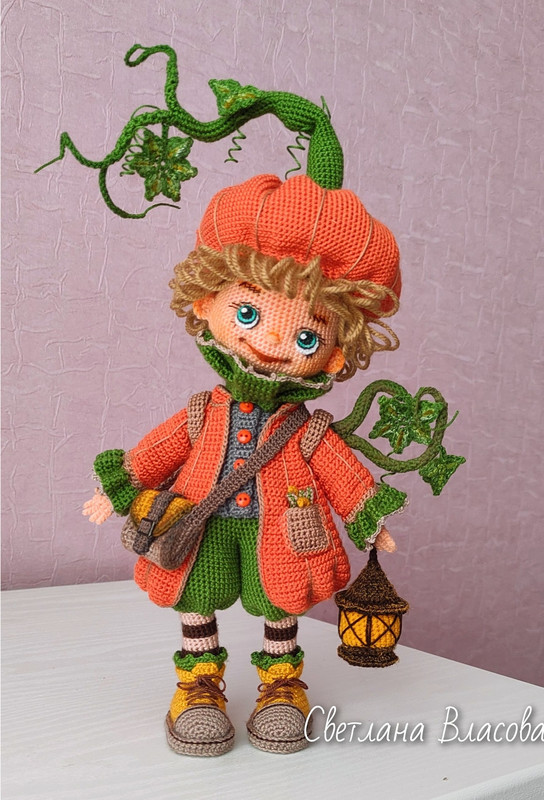 Куколка «Тыковка». Высота 20 см без шапочки. Голова поворотная, ручки, ножки, шея гнутся за счёт проволочного каркаса. Из одежды и аксессуаров съёмные пальто, воротник, сумочка, фонарик.