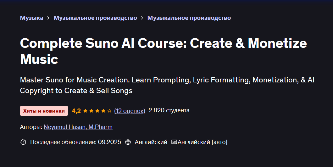 [Udemy] Полный курс Suno AI: Создание и монетизация музыки [Neyamul Hasan]