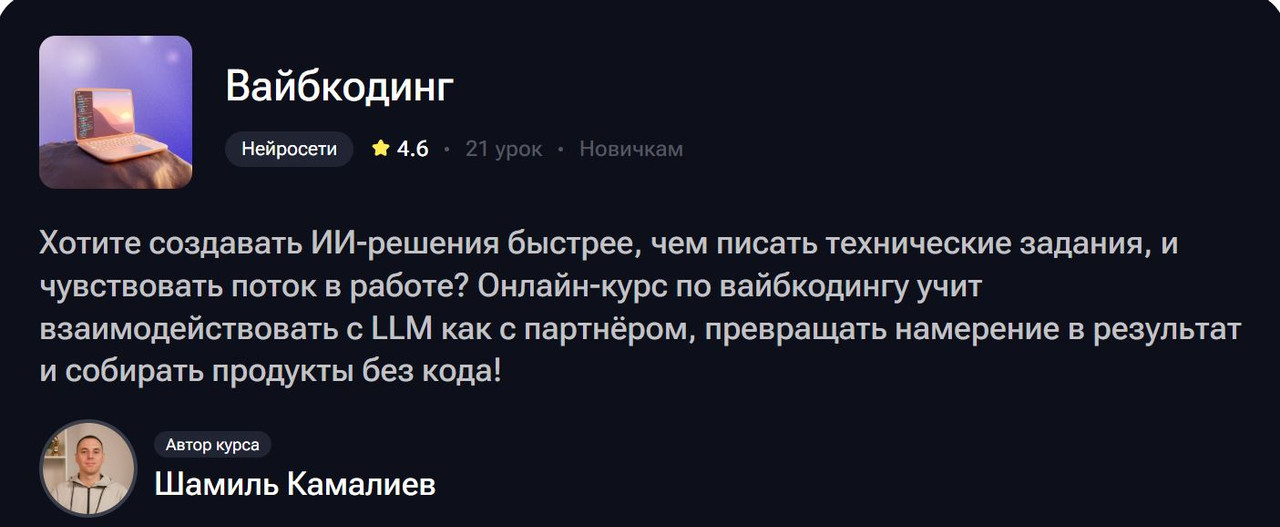 Присоединяйтесь к курсу «Вайбкодинг» и начните создавать AI-решения на скорости мысли. Ваши идеи заслуживают воплощения. Прямо сейчас.