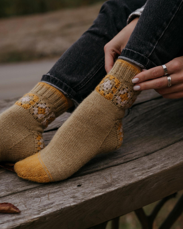 Интересное сочетание двух техник (квадраты вяжутся крючком, носок спицами)