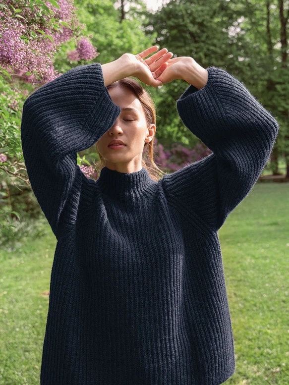 Женский свитер оверсайз из альпаки, вязаный спицами сверху вниз резинкой с формированием регланом.