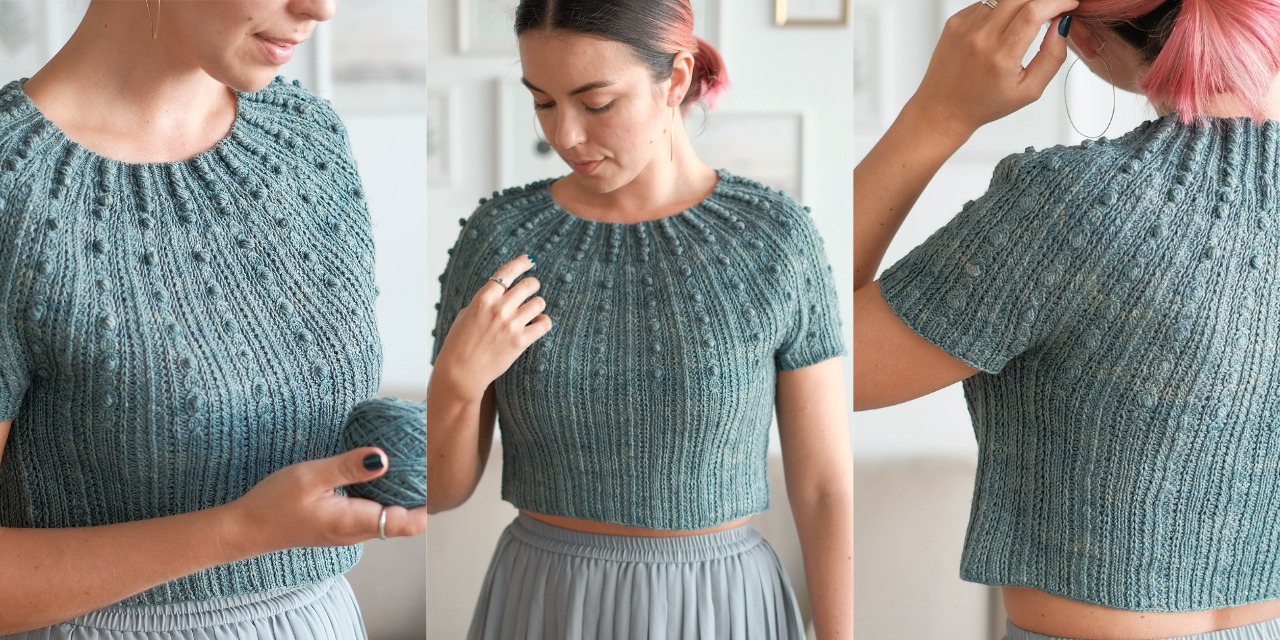 Топ вяжется сверху вниз с круглой кокеткой. Вырез горловины формируется укороченными рядами. Этот дизайн отличается снятыми и скрещенными петлями, небольшими скошенными полосками, японскими обернутыми петлями и двумя видами нуппов (шишечек). Основной узор легко запоминается и его интересно вязать. Узор представлен как в виде схемы, так и расписан порядно.