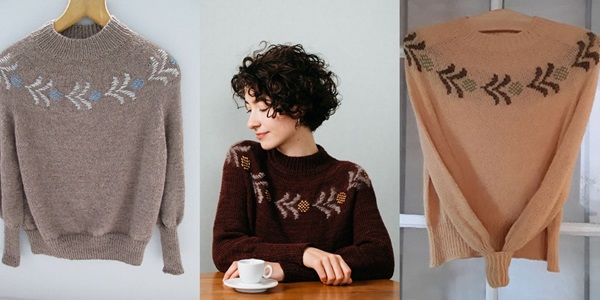 Женственный джемпер с круглой кокеткой, вязаный спицами с цветочными мотивами.