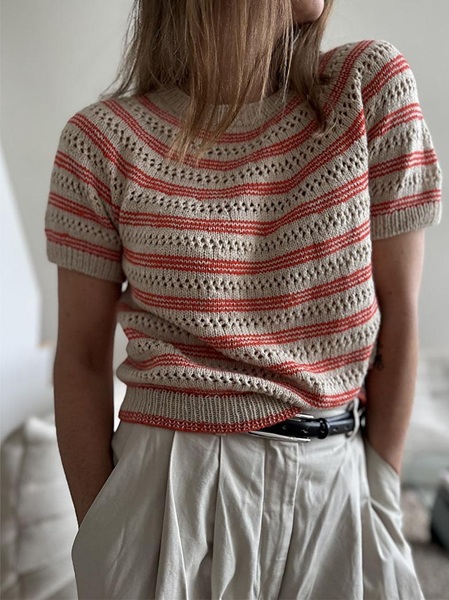 HALO_LOOP-TEE – футболка с классической круглой кокеткой, с чередованием двухцветных полосок и секций ажурной вязки, за счет чего эта модель выглядит современно и, в то же время, очень женственно.
