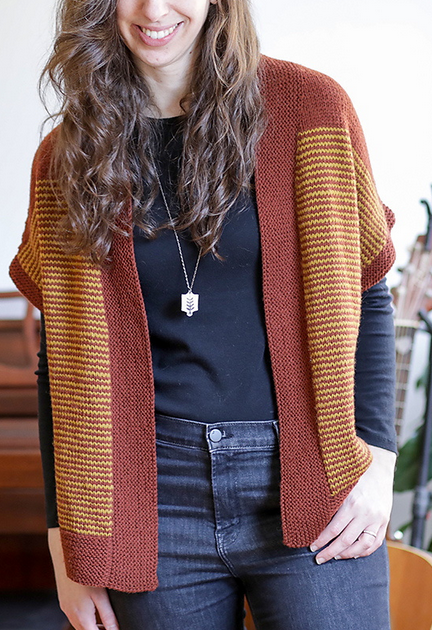 Этот кардиган вяжется спицами одной деталью снизу вверх. Работа начинается с однотонной планки низа, которая переходит в тело полосатым узором. Полоски вяжутся в каждом ряду и это повод попробовать новую технику вязания. По низу пройм детали разделяются и вяжутся половинки переда и спинка. Завершают работу планки пройм и горловины.