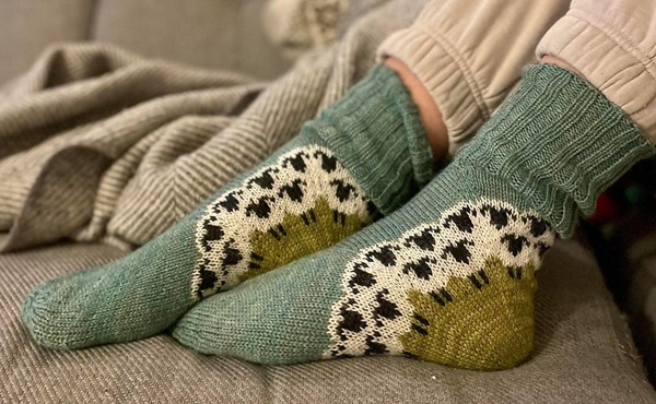 Эти носки вяжутся спицами от пятки. Работа начинается с жаккарда по кругу, затем петли делятся на несколько секций для паголенка и ступни.