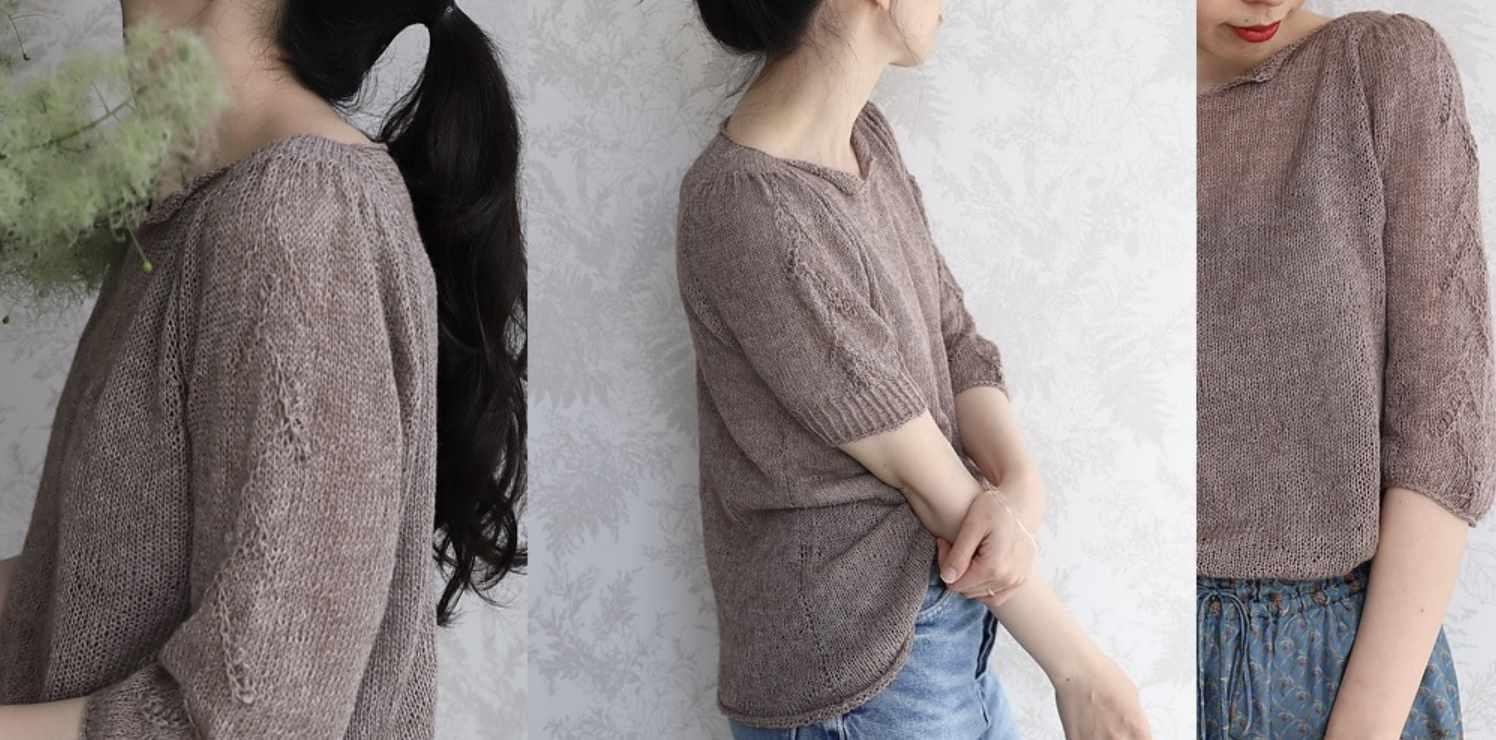 Пуловер Konomi вяжется регланом сверху вниз. Горловина сначала вяжется прямыми и обратными рядами, затем соединяется для вязания круговыми рядами, на рукавах выполняется мотив Konomi. У пройм петли рукавов отделяются от петель туловища, которое вяжется круговыми рядами с формированием А-силуэта. Рукава вяжутся круговыми рядами, от проймы вниз. Длину рукава вы выбираете сами: короткую или до локтя.