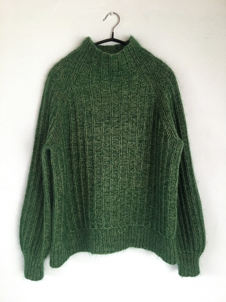 Этот пуловер вяжется спицами по кругу сверху вниз. Воротник стойкой переходит в кокетку регланом, где широкая линия реглана вяжется узкой резинкой, а само тело широкой резинкой. Нить мохера, добавленная к основной нити, сделает этот пуловер не только теплым, но и воздушным.