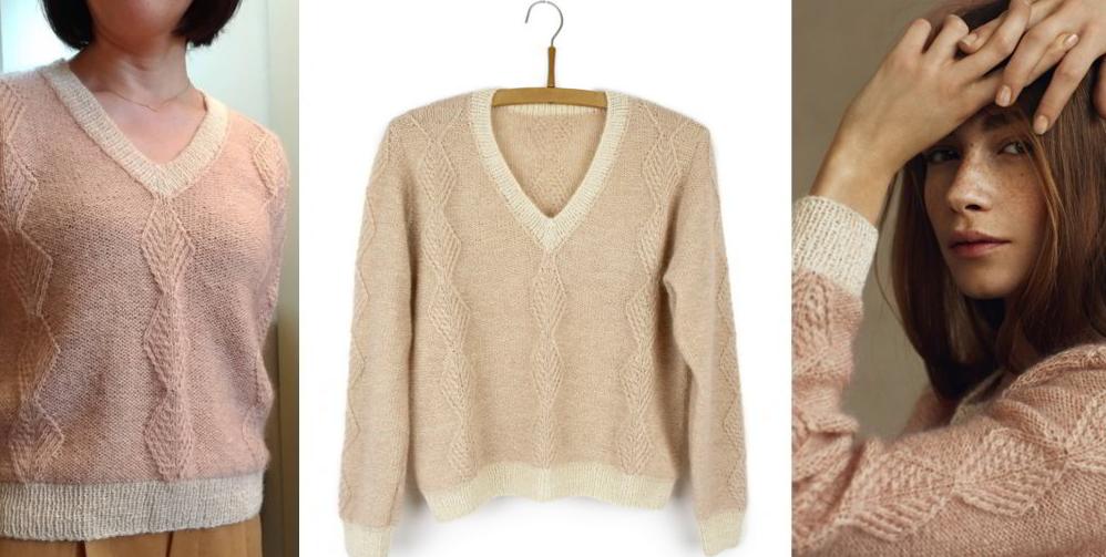 Женский пуловер от датского дизайнера Хельги Исагер вяжется из тонкой шерсти с добавлением ниточки тонкого мохера. Планки пуловера также вяжутся, миксуя тонкую ниточку альпаки с тонким мохером. Модель получается и легкой, и нежно-воздушной одновременно, осталось только добавить несколько штрихов узора с ромбами, чтобы разбавить простое полотно изнаночной глади и не заскучать в процессе вязания.