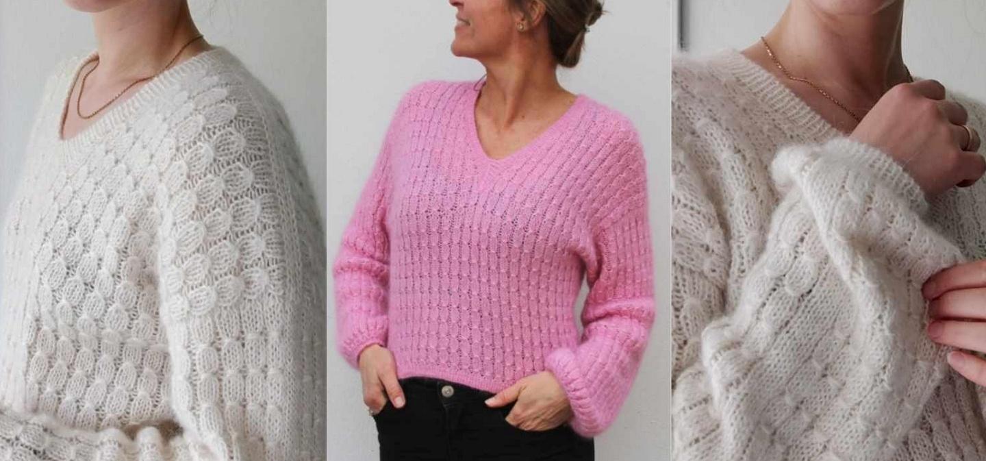Пуловер вяжется спицами сверху вниз. Сначала вяжется верхняя части спинки, затем плечи, поднимая петли и обрабатывая диагональный край двойной вязкой по краю спинки. Затем снова, уже по плечам, поднимаются петли для передних деталей, которые вяжутся с прибавками, чтобы сформировать V-образный вырез горловины. Передняя и задняя части соединяются под проймой, и тело вяжется по круглому узором Smock. Петли рукавов поднимаются вокруг пройм и вяжутся по кругу узором Smock. Все края отделаны небольшой двойной резинкой с итальянским закрытием петель. Этот пуловер не требует сборки.