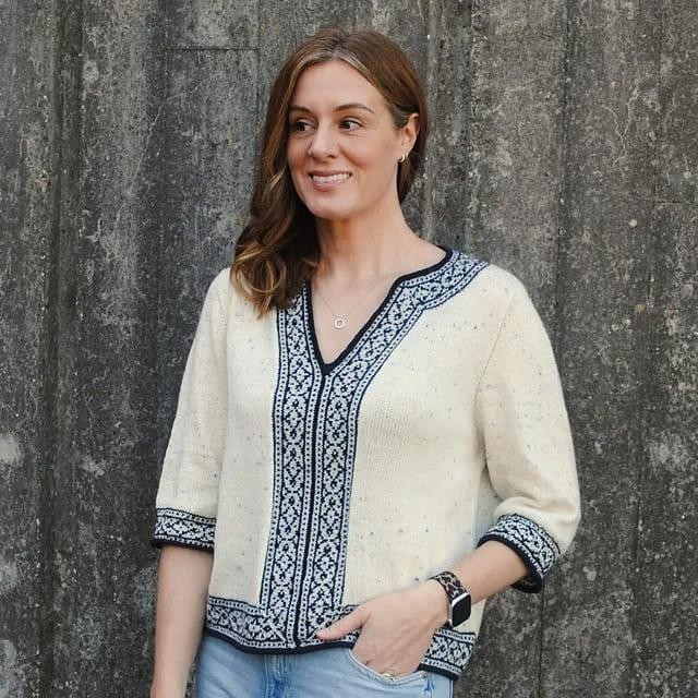 Изделие вяжется сверху вниз, начиная со спинки. Как только деталь спинки достигнет глубины проймы, петли для каждой детали переда поднимаются вдоль плеч и вяжутся сверху вниз. После завершения деталей переда и спинки они соединяются в нижней части проймы и вяжутся поворотными рядами лицевой гладью до нужной длины. Затем вокруг переднего выреза горловины поднимаются петли, чтобы выполнить жаккардовый узор по кругу, спереди и на талии. На заключительном этапе жаккардового узора детали переда сшиваются вместе.
