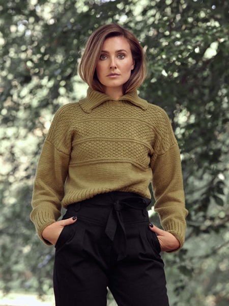 Женский свитер с узором в стиле гернси на кокетке в коллекции Adore от Ким Харгривз представлен в двух вариантах цвета и с двумя видами воротника: отложным и поло. Свитер модной укороченной длины.