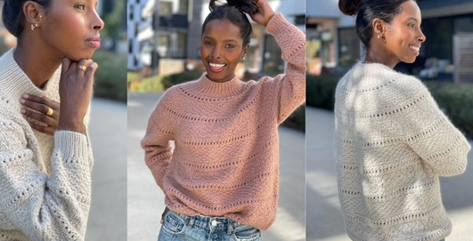 Прекрасный свитер оверсайз с круглой кокеткой выполняется спицами теневыми узорами, сложив нить мериноса Bystrikk Merino и 1 нить мохера Tynn Kidsilk Erle.