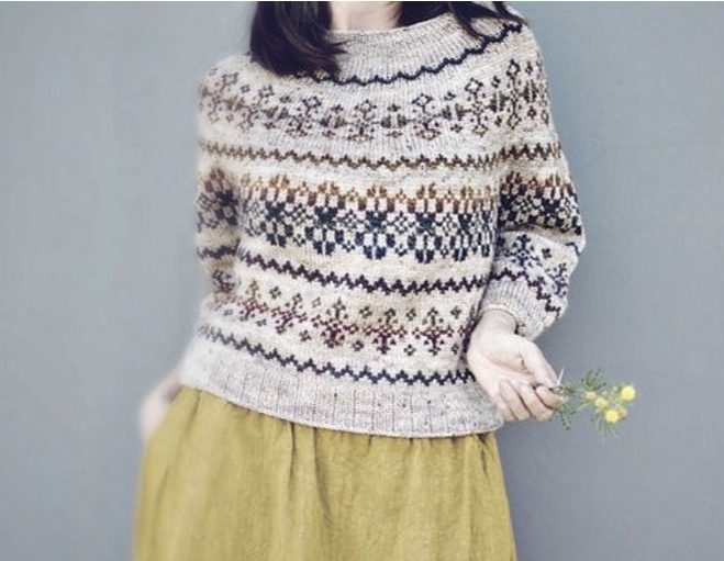 Свитер с жаккардовым узором и круглой глубокой кокеткой вяжется спицами без швов сверху вниз.