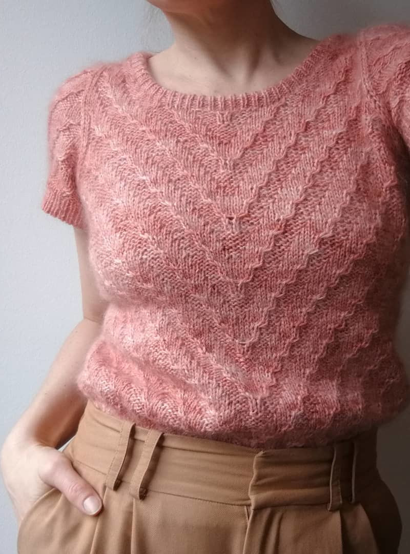 Женский топ с элегантным диагональным узором резинкой. Топ имеет короткие рукава с небольшим фонариком на плече. Топ вяжется снизу вверх, одной деталью с различными приемами убавок, которые гарантируют хорошую посадку и красивый узор. Планка горловины вяжется круговыми рядами, двойной резинкой. Если связать длинные рукава, получится оригиналный пуловер.