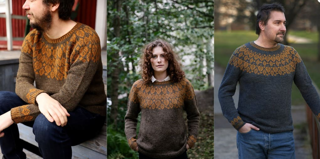 Пуловер Foliage (листва) вяжется сверху вниз, без швов. Он имеет круглую кокетку с жаккардовым узором в виде листьев, который повторяется на манжетах. Гофрированная резинка придает аккуратный завершающий штрих.