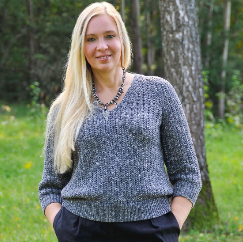 Подобрать удачный узор для ленточной пряжи очень сложно, и не все узоры на ней хорошо смотрятся. Ленточка чаще всего мнётся и сгибается. Для демонстрации её исключительности нужны длинные и вытянутые петли. Сначала была пряжа, далее в голове родился подходящий узор, а потом и сам дизайн, где горловина без отделки намекает на некую небрежность и неухоженность хвоща, а вертикальный ритмичный характер узора отображает ступенчатые его побеги. Если нет ленточки, подойдёт любая другая, даже тёплая зимняя пряжа.