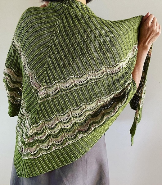 Хризантема — это асимметричная треугольная шаль, вязаная сверху вниз от платочного язычка и регулярными прибавками по краям и центральной оси для придания ей окончательной формы. В секциях с фестончатыми лепестками чередующиеся цвета проходят по правому краю лицевых рядов, а завершается шаль эластичным закрытием петель резинки, обеспечивающей чистое и контролируемое растягивание резинки.