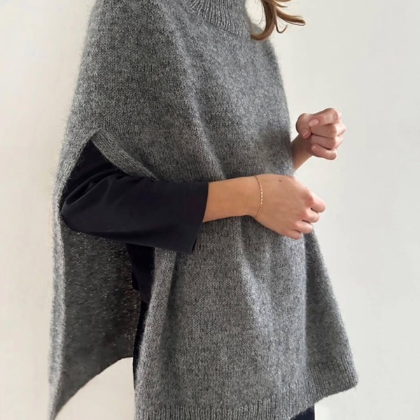 Кейп вяжется без швов, сверху вниз, лицевой гладью. Боковые кромки, низ переда и спинки и планка горловины выполняются обычной резинкой 1 х 1. На определенной высоте кейпа формируются интересно обыгранные боковые разрезы.