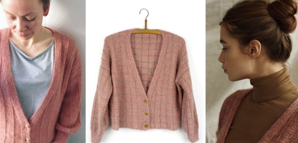 Модный женский жакет вязаный спицами из пряжи с мохером с глубоким V вырезом и узором со снятыми петлями.