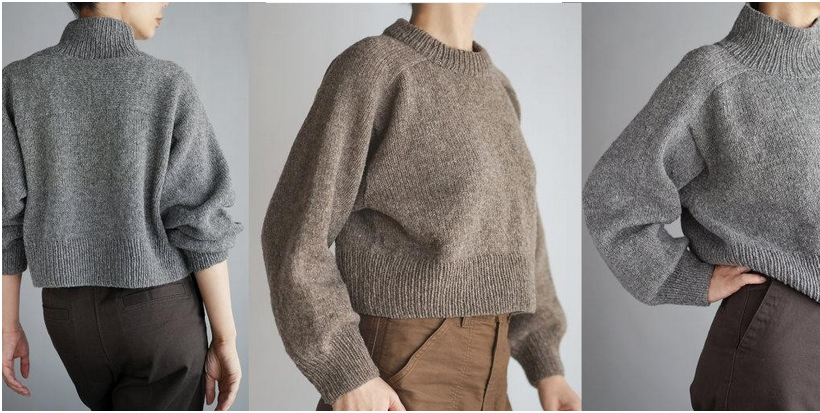 Глубокая, просторная кокетка, простирающаяся от спинки до рукавов, создает непринужденный и удобный силуэт. Вязание начинается с секции плеч и спинки, которая вяжется в поперечном направлении, затем поднимаются петли для переда и спинки. Они соединяются в подрезе проймы и вяжутся по кругу до нижнего края. Петли рукавов и воротника также поднимаются по корпусу и вяжутся по кругу. Вы можете выбрать между воротом водолазкой и двойной планкой. Длина немного укорочена, чтобы подчеркнуть свободу корпуса, но поскольку он вяжется сверху вниз, вы можете легко регулировать длину по ходу вязания (обратите внимание, что это может повлиять на расход пряжи).