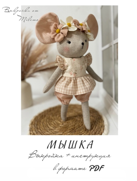 Размер — 36см. Без учета ушек.В комплект входят выкройки: мышки, блузка, шортики, цветочная повязка и инструкции к ним.