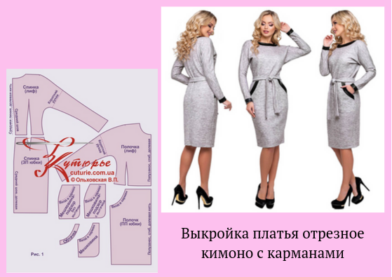 Выкройка платья отрезное кимоно с карманами.